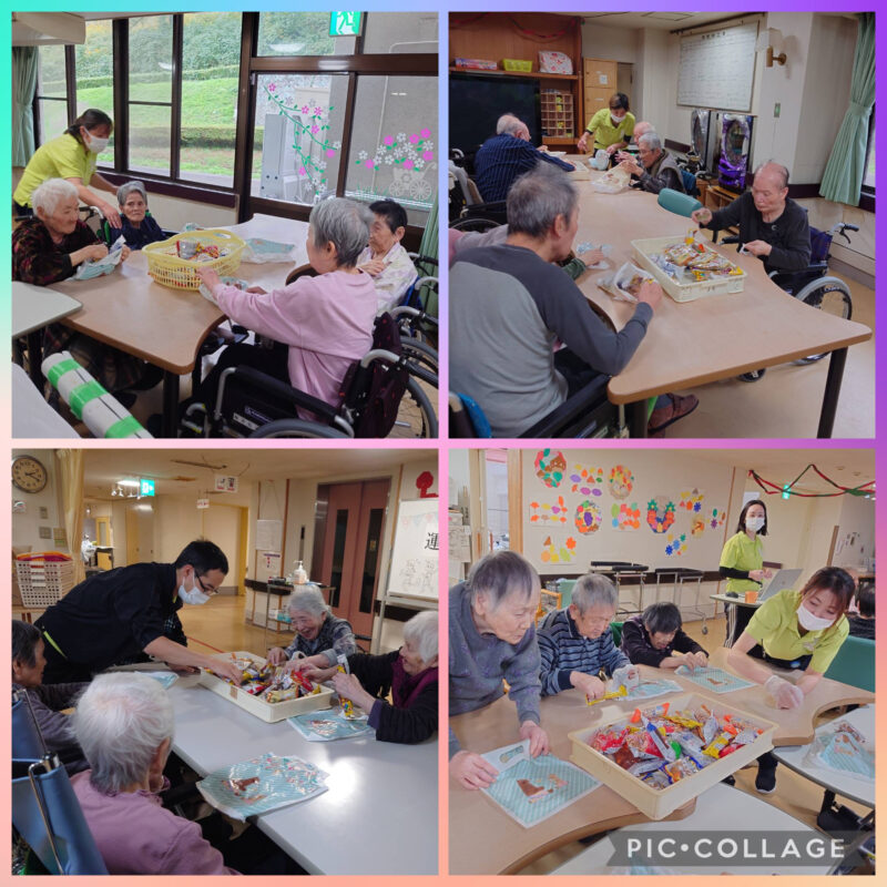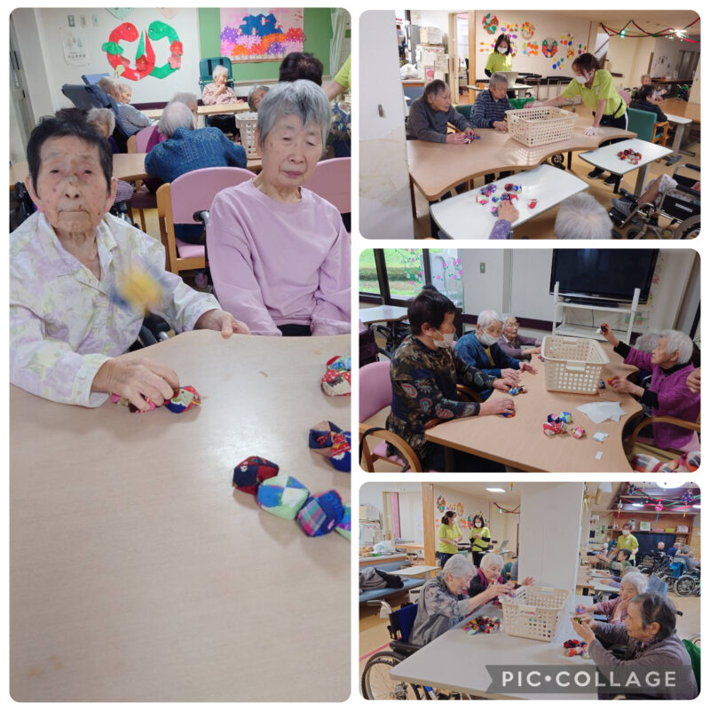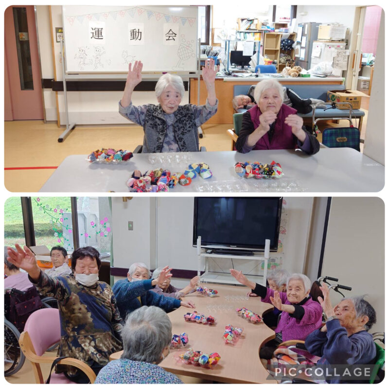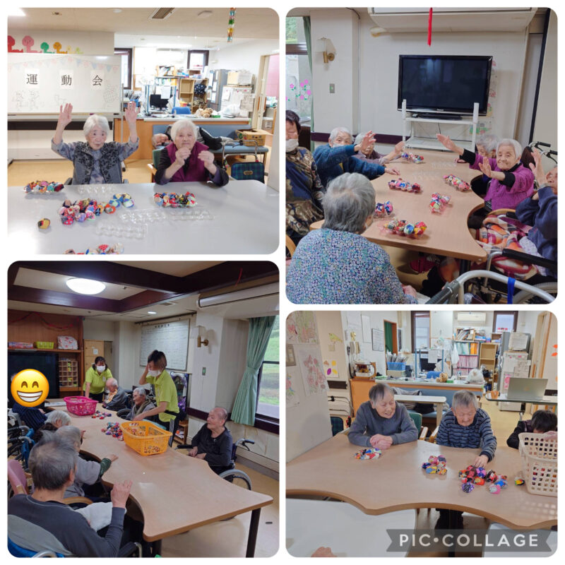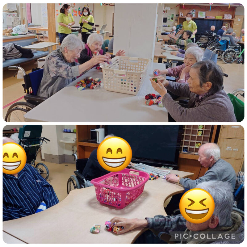 最初の競技は、テーブルの中央に置いたカゴをめがけてボールを投げ入れるゲーム。利用者様も職員も一緒になって「入った!」「惜しい!」と大盛り上がりでした。次の卵パックのゲームでは、誰が一番早くお手玉を並べられるか真剣勝負皆さん集中しながらも笑顔があふれていました。そして最後は、お楽しみのお菓子ゲーム。