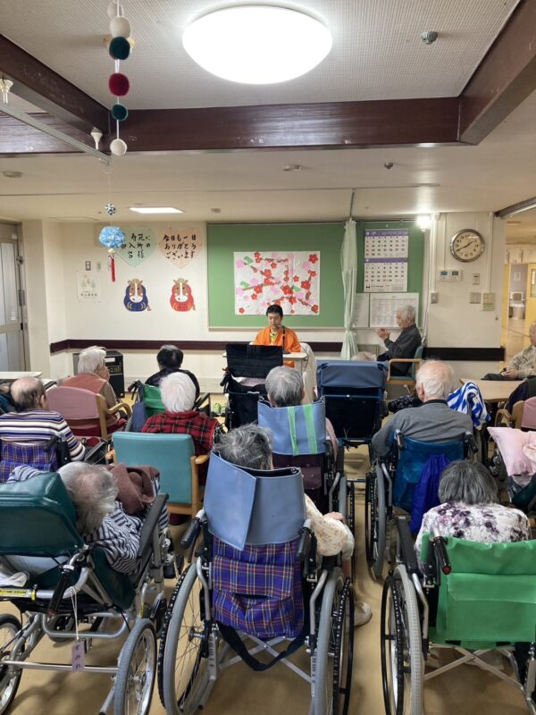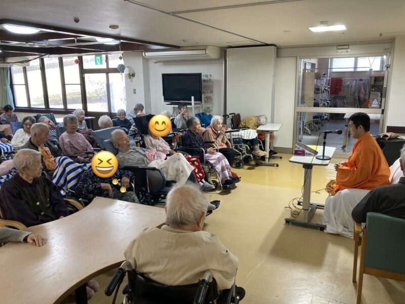本日のレクレーションでは、職員による落語が披露されました。巧みな話ぶりに利用者様からは、笑い声がたくさん聞かれ会場は和やかな雰囲気に包まれました。